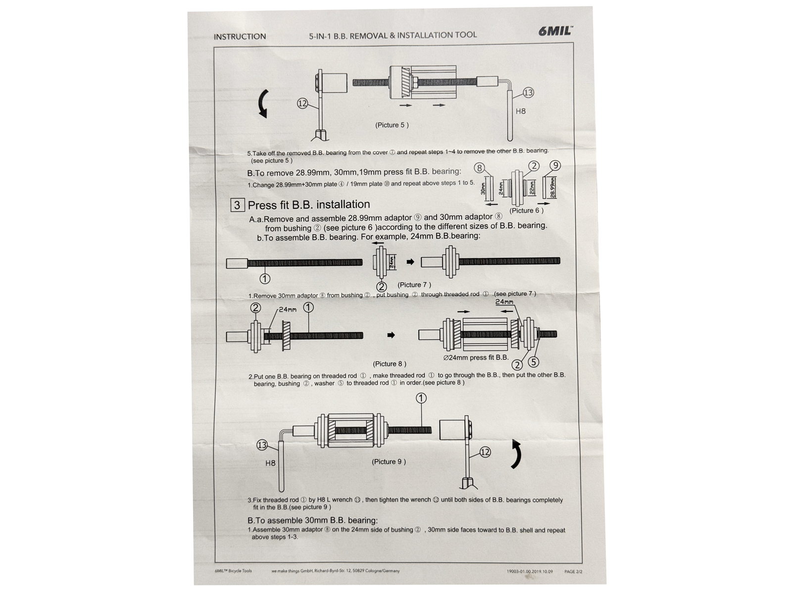 The 6MIL BT-01 BB Installation/Removal Tool is a versatile bottom bracket tool designed for press-fit bottom brackets on most BMX frames and various other bike frames. It allows for both the installation and removal of press-fit bottom bracket bearings without damaging your frame. This tool is compatible with a wide range of press-fit bottom bracket models.