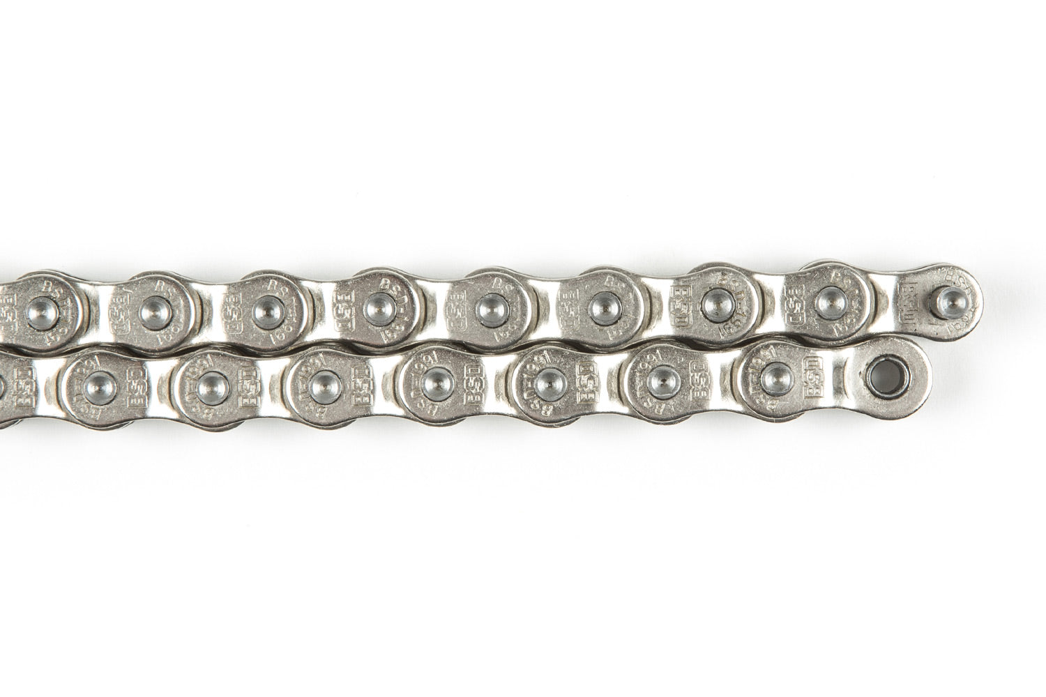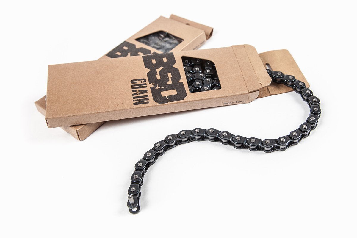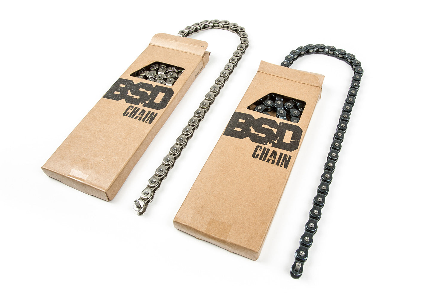 A super tough halflink chain with rustproof and teflon coating, stamped BSD logos and mushroomed pins. Compatible with 8t drivers.