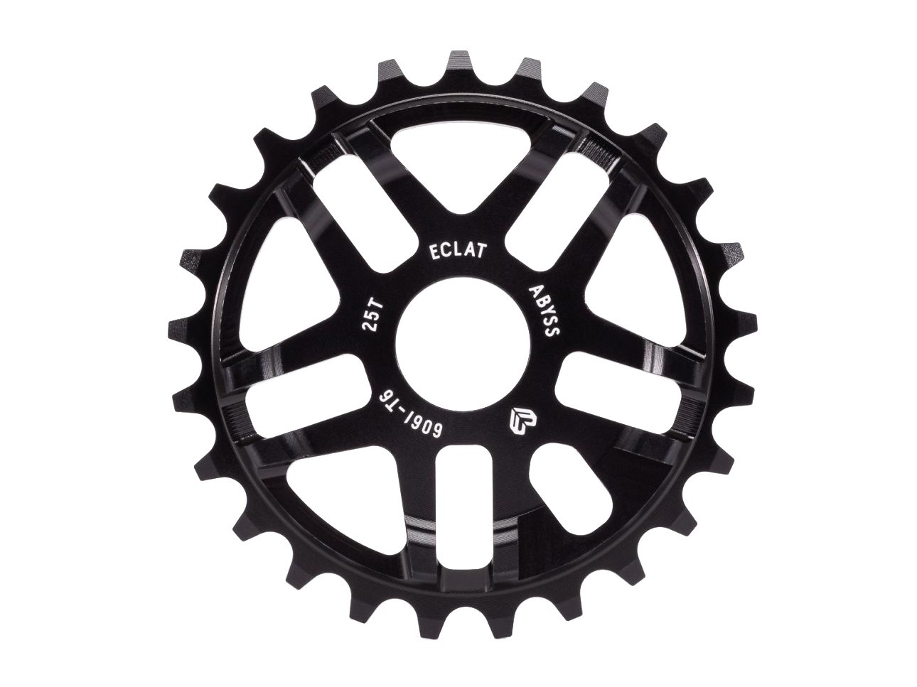 The Abyss Sprocket use a fresh design based around keeping the weight down, but the stiffness and strength of the sprocket up. The unique ribs add chain protection and give the sprocket extra stiffness to reduce flex. CNC machined from 6061-T6 alloy and is available in 25T and 28T . The Abyss is supplied with adaptors so it can be run on 24, 22 and 19mm spindles. The offset teeth on the sprocket help to maintain a perfect chain alignment on all setups.