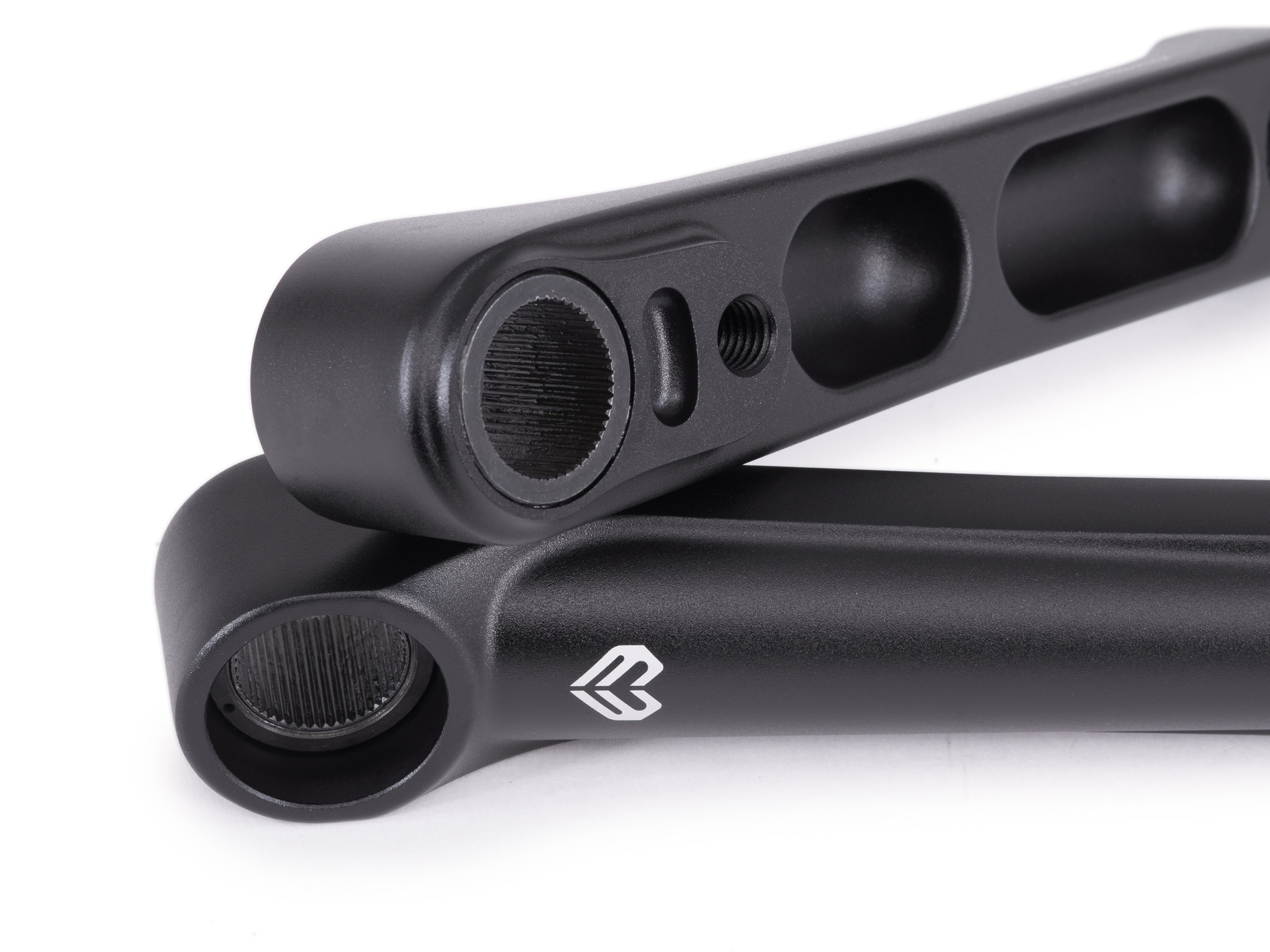 • Behold the MAVERICK cranks. These cranks are all about strength, as anyone who’s ever snapped a pair of cranks will know; it’s usually at the welding where things let go. This is where alloy really comes into its own, being able to forge in a 3D shape means you can avoid the welding, and therefore the weak spot. What’s totally unique about the Mavericks is their use of a regular 48 spline. Until now alloy cranks were only available with a mountain bike style square spindle and a pinch bolt on the arm. Eclat wanted to raise the bar and clean up the looks, and thanks to a heat treated crmo insert into the alloy its all been made possible.