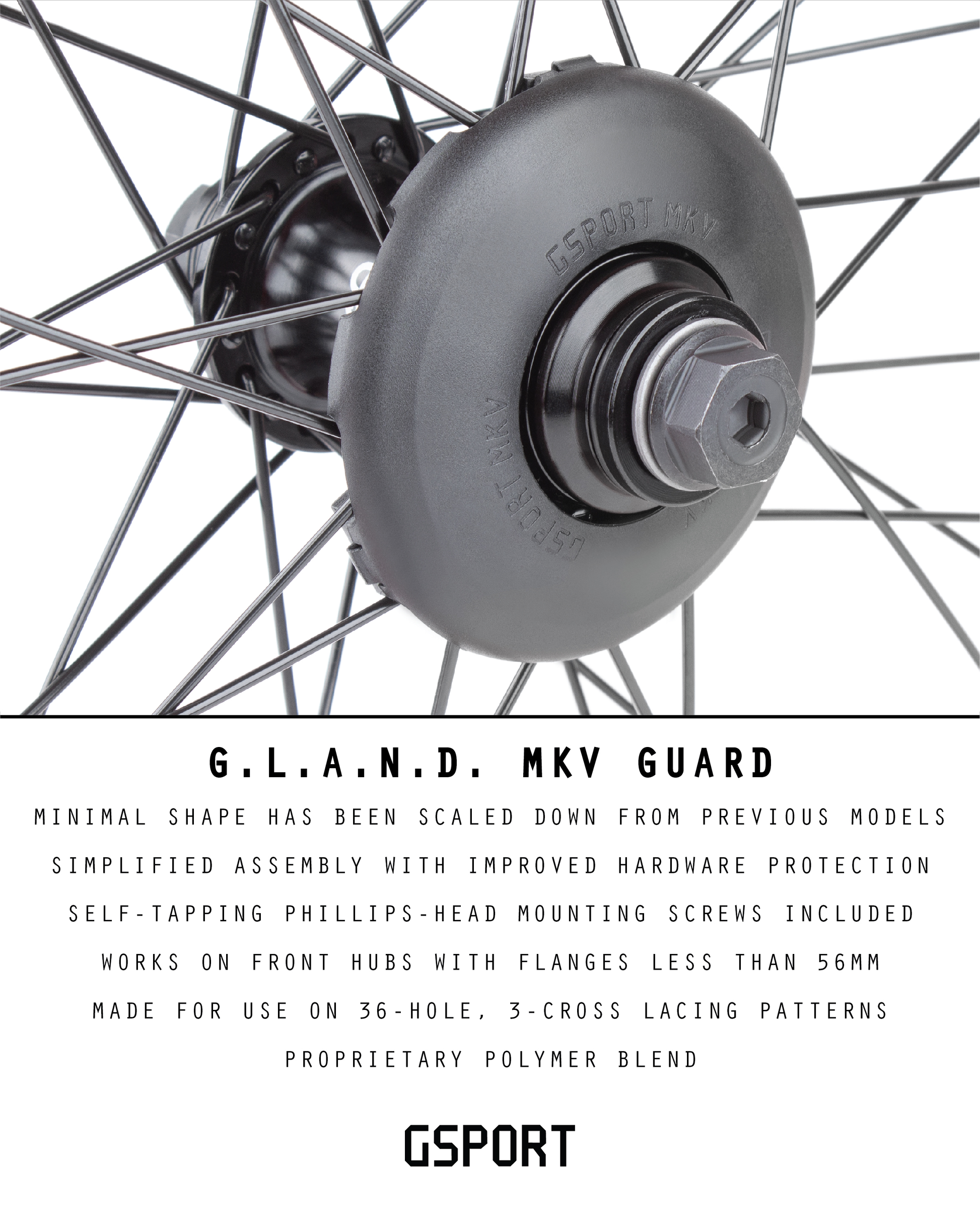 The updated design attaches to the wheel via easily sourced self-tapping Phillips-head screws and the G.L.A.N.D.’s fold-over locking tabs that keep the guard centered and firmly seated on the spokes. Super light, super affordable, and will fit most 36-H front hubs with a 3-Cross lacing pattern.