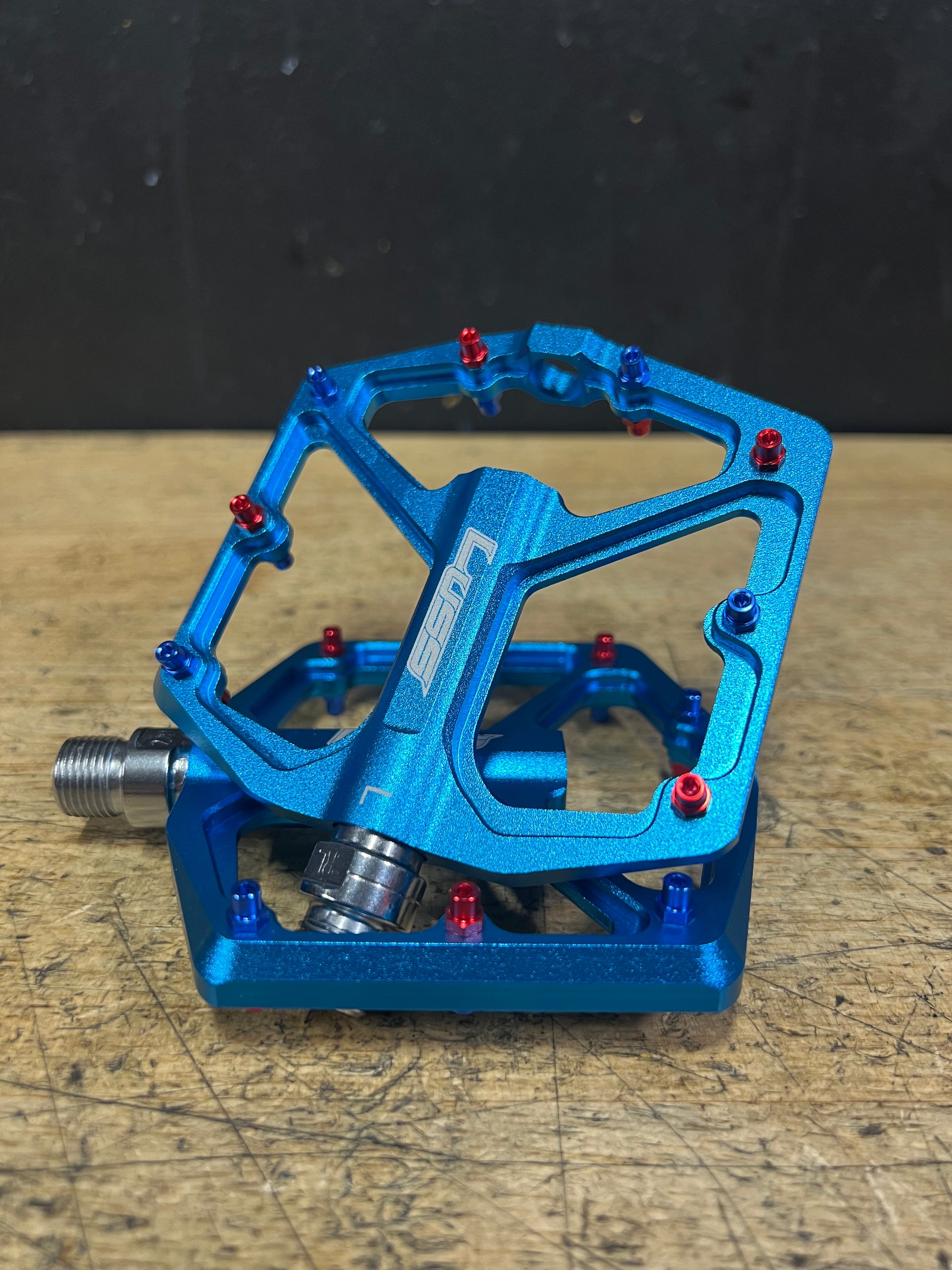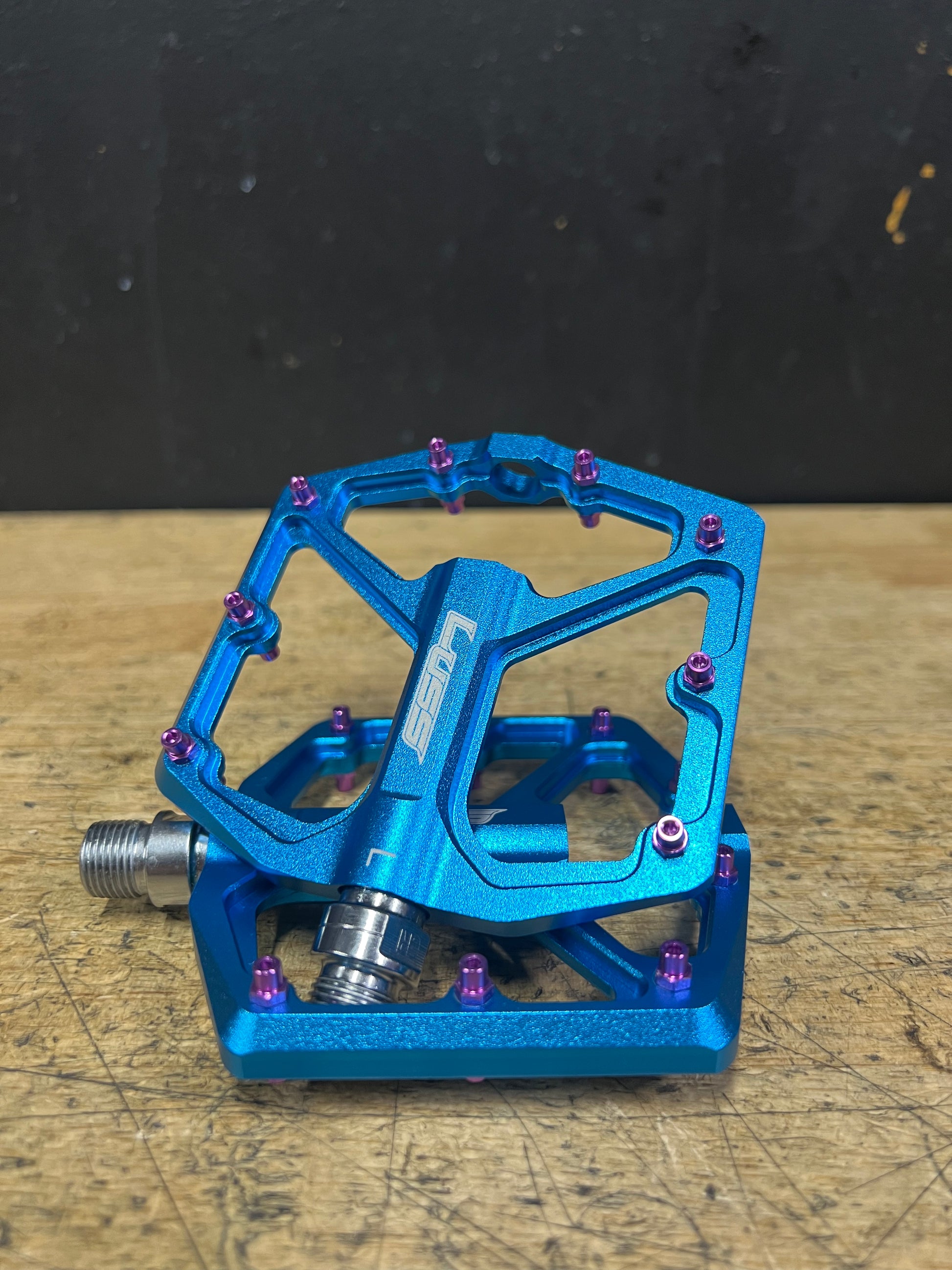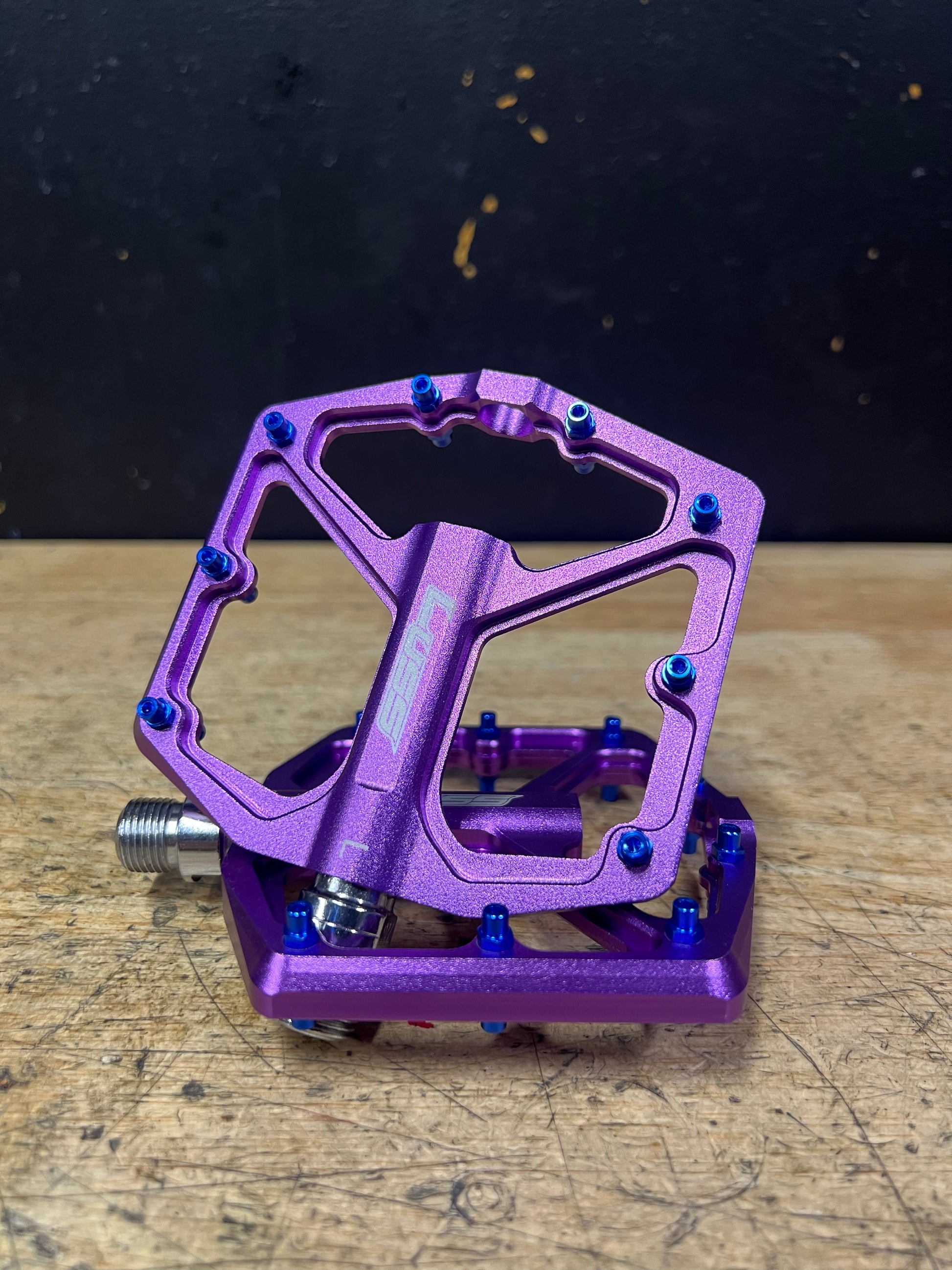 Truly One-of-1 Our double flat pedals can be all sorts of colours. Available in Red, Blue, Purple. Pair them with our very own XL pins in multiple colours and we have created a design playfield for you.
