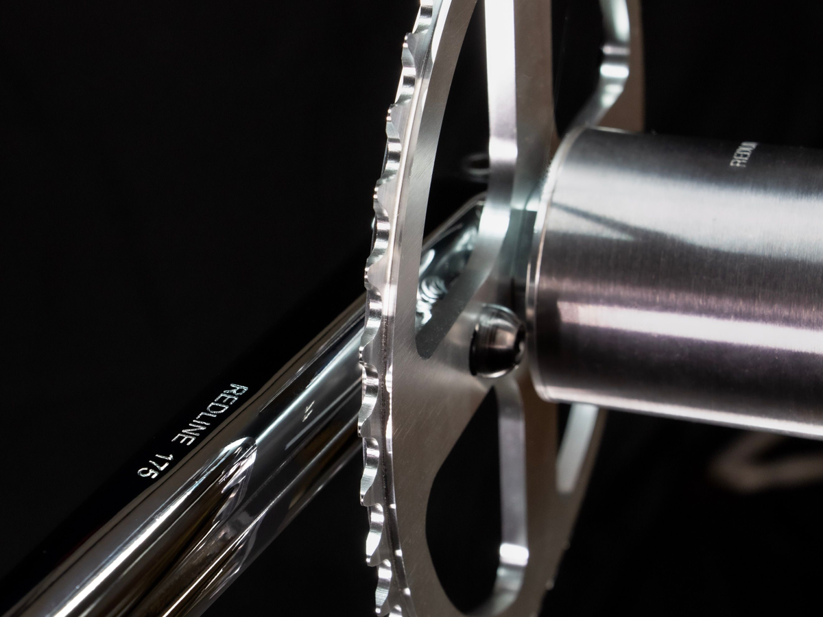 The iconic Redline Flight 44-tooth sprocket is manufactured using CNC engraving to recreate the logos and surface design accurately. The spindle borehole diameter reverts to that of the original 1980s crank and pairs with the double dimple Redline Spindle.