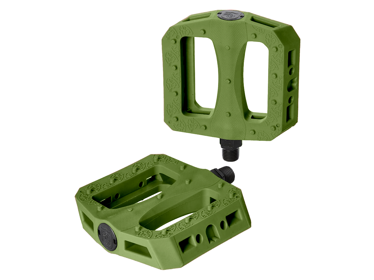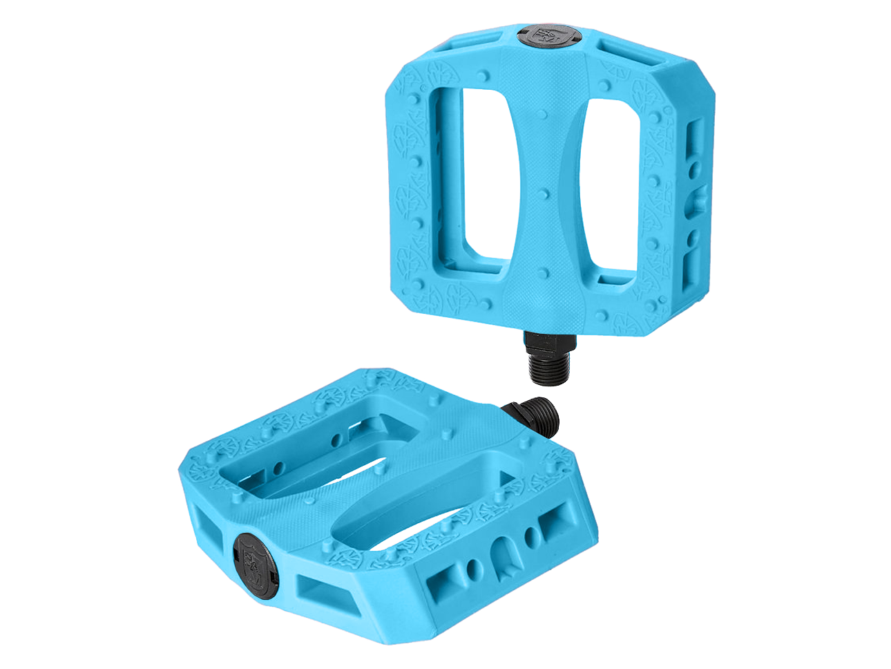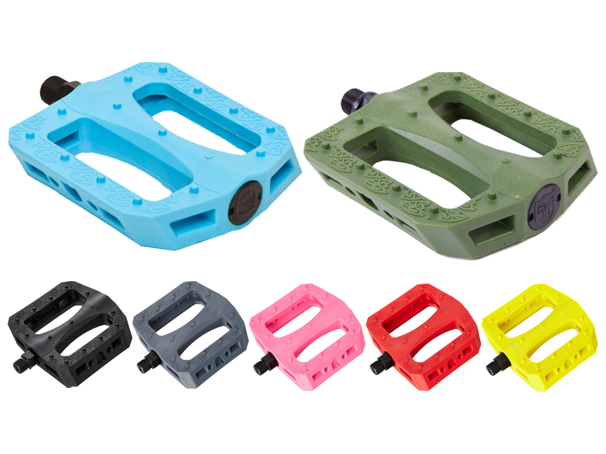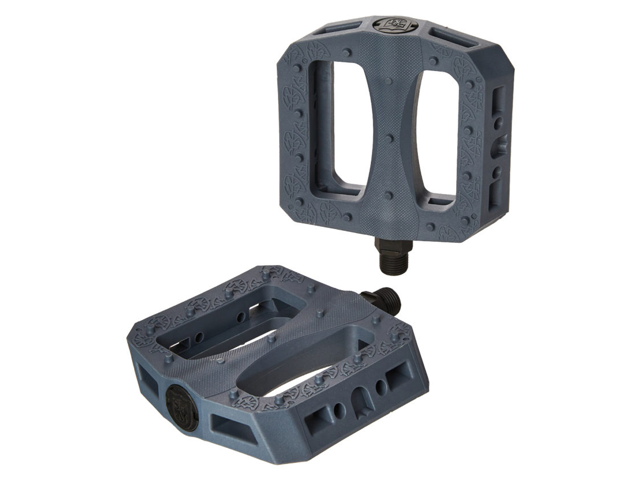 Oversized CrMo spindle for strength. Large body. Thin design. Accepts 6mm Allen, 15mm and 17mm wrenches for installation/removal. A wider surface also allows the use of an adjustable wrench. The larger, ergonomic shape is designed for grip and support. Micro-knurled surface and moulded pins for traction. Long-lasting nylon/fiber blend for sliding.