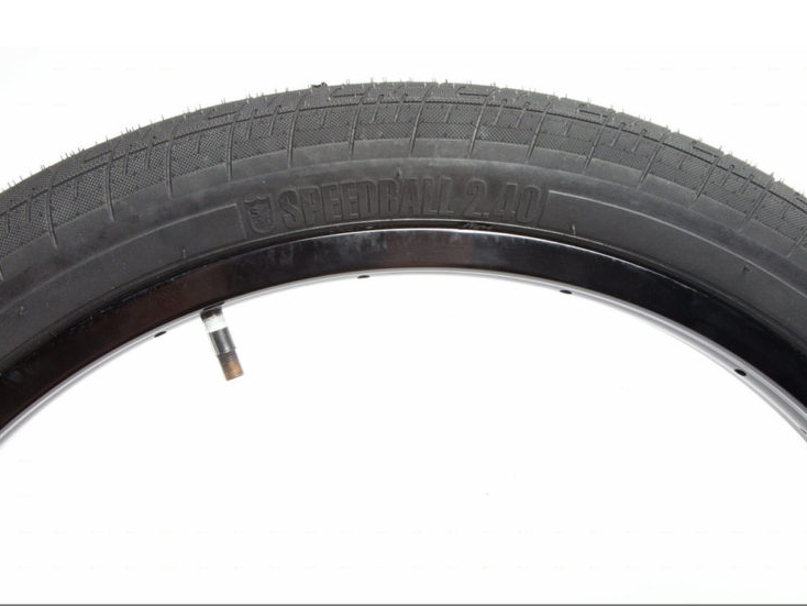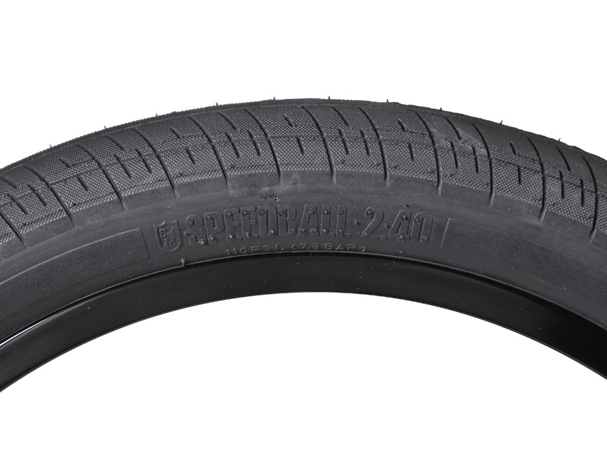 The Speedball is S&M's street tyre. Available in a wire bead only in a high-pressure casing with extra pinch flat protection for street riders that run lower pressure. The Speedball features a multi-edged S&M shoulder tread design that looks cool and holds the ground. The 20″ Speedball has a smooth unbroken center strip for less rolling resistance, while the 22″ and 26″ have a broken center tread making them great dirt/street/park tyres. The 20 x 2.25 and 22 x 2.25 are light and fast and work well in the front or rear. They are big enough for today’s street riding but small enough to stay out of the way on grinds, spines, or frames and forks with minimal clearance. The 2.4 works equally well on the front and rear for riders who prefer big tyres.