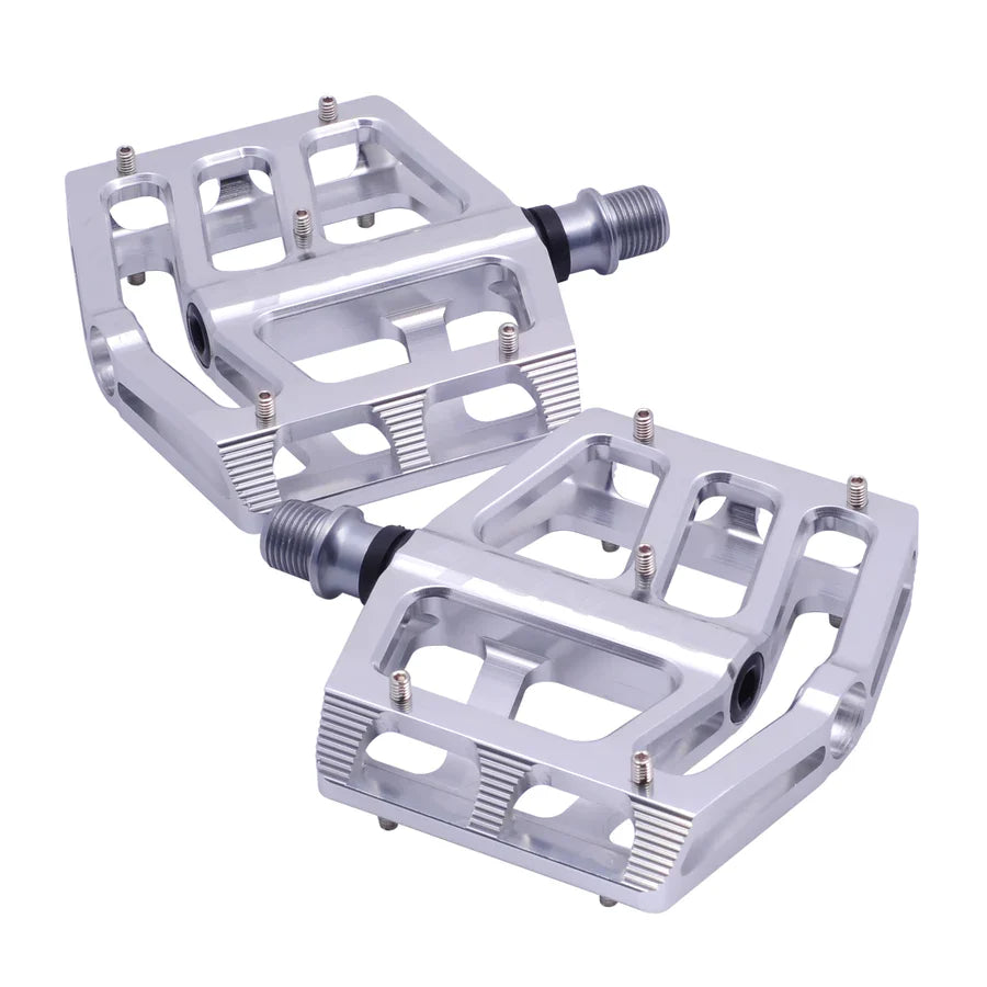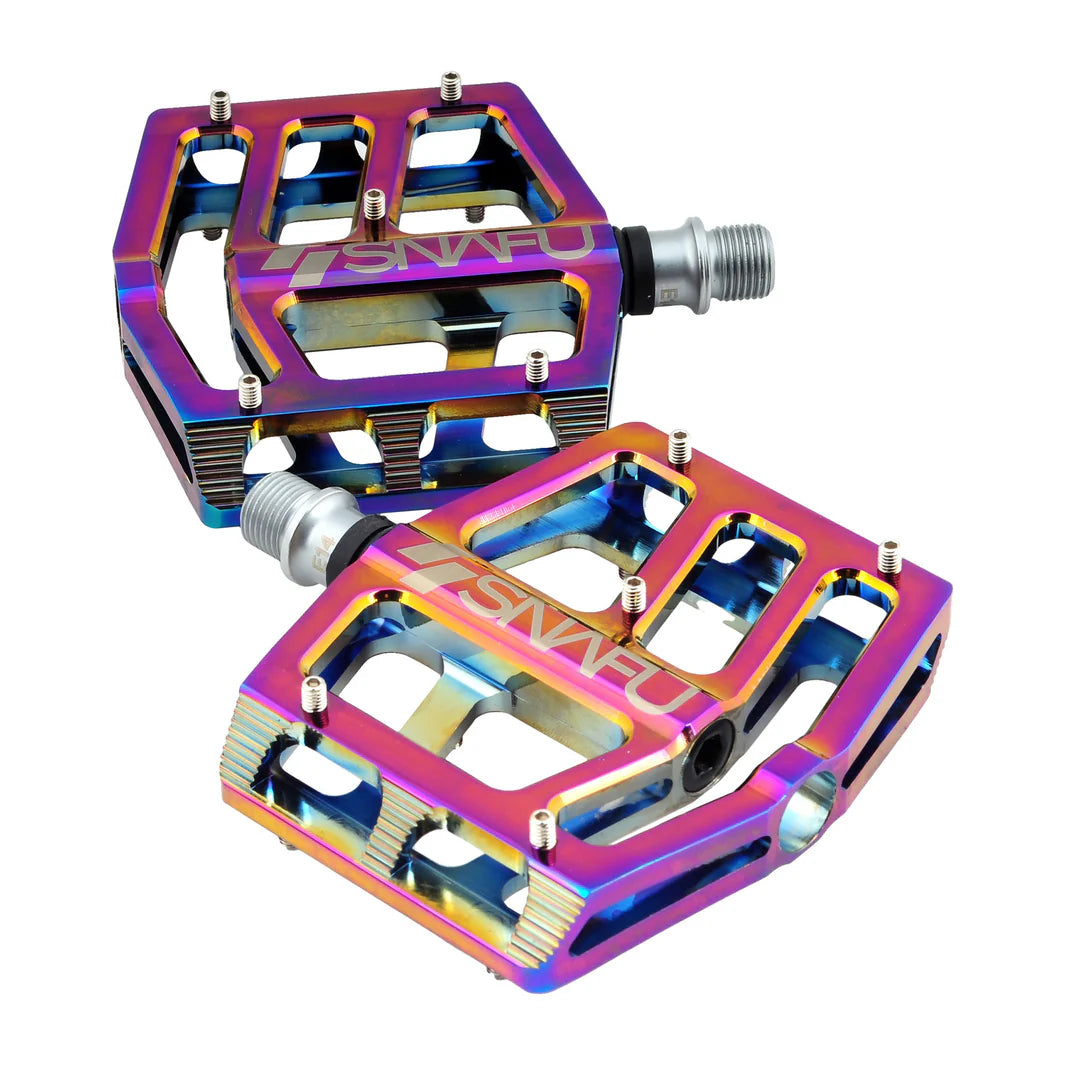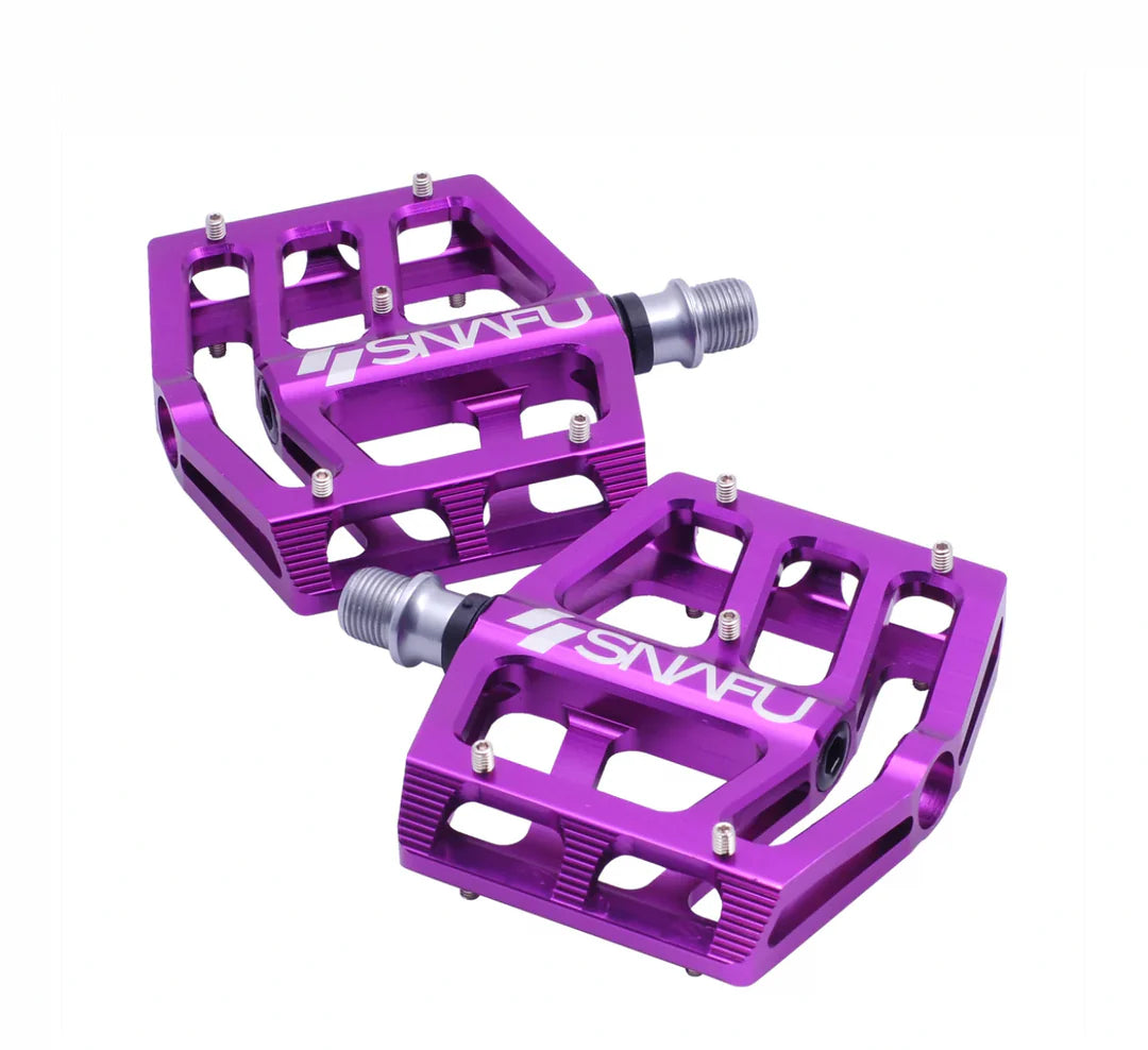The SNAFU Cactus Wide Pedals are made with an extruded and CNC-machined 6061 T-6 alloy construction. Forged heat-treated 4130 chromoly 9/16in spindles. Internal bushing with sealed roller bearings, a 100mm platform width, replaceable pins, and low-profile 19mm cross-sections.