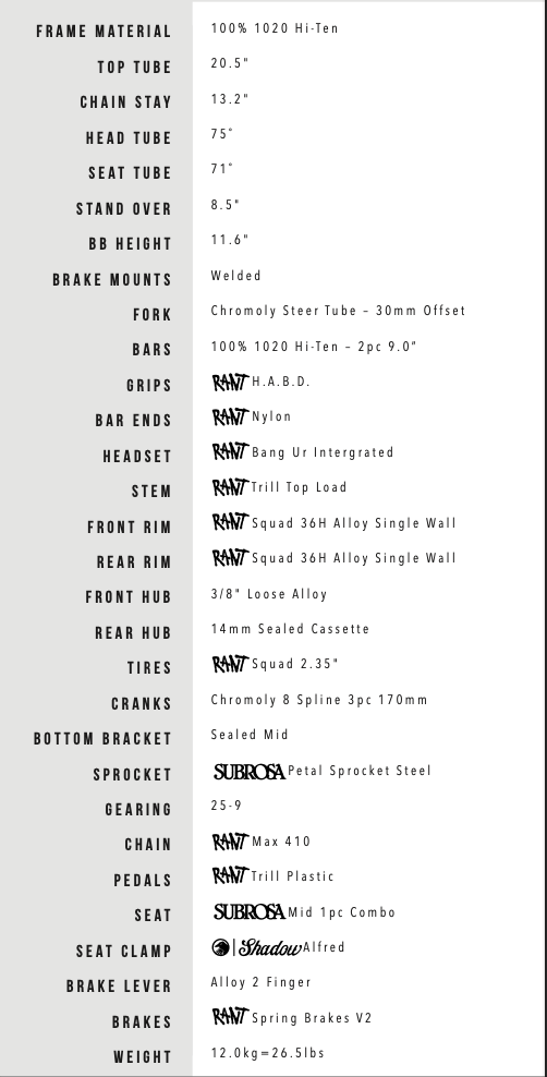 To get yourself on a super unique, high-spec rig this year, this is your chance! Subrosa has specifically built these for the avid rider in mind, featuring high-end parts from Subrosa and their sister company Rant, these bikes are ready to hit the streets, park or Dirt Jumps right out of the box.
